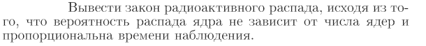 Вывести закон радиоактивного распада, исходя из того, что вероятность распада ядра не зависит от числа ядер и пропорциональна времени наблюдения.