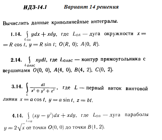 Решения 4-х заданий на криволинейные интегралы из Рябушко части 3 ИДЗ 14.1 вариант 14