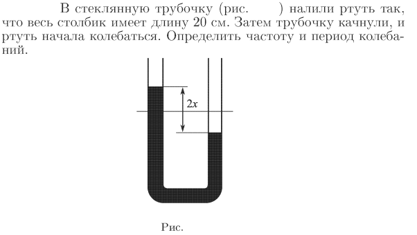 В стеклянную трубочку (рис. 35.6) налили ртуть так, что весь столбик имеет длину 20 см. Затем трубочку качнули, и ртуть начала колебаться. Определить частоту и период колеба-