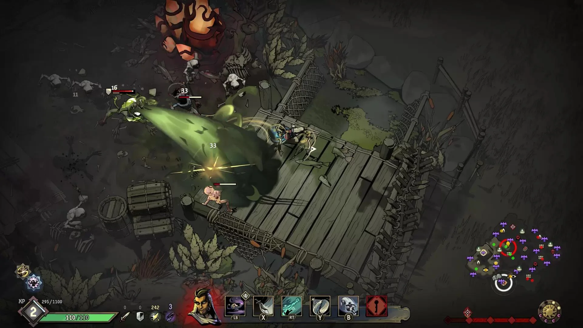 Ravenswatch is a top-down roguelike action game in which you play as heroes of tales and legends that must slay hordes of nightmarish creatures in nerve-racking fights. After the success of Curse of the Dead Gods©, Passtech Games returns with an improved formula and an addictive game experience with endless replay value. It can be played solo or with up to four players in co-op. Play as 9 heroes, each with a unique twist and individual gameplay, including Little Red Riding Hood, who suffers from lycanthropy; Sun Wukong, the fallen monkey king; the Snow Queen with her evil powers; and many other familiar characters who have a darker side and are more violent than you might remember. The Nightmare has invaded the world of dreams and is corrupting everything in its wake. Faced with this evil, the Ravenswatch is gathering heroes from tales and legends from all over the world to lead a crucial battle and restore the fragile balance. But the heroes themselves have been corrupted. How deep do the roots of this evil go? Explore 3 open maps filled with activities and inspired by enchanted forests and marshes, One Thousand and One Nights, and Arthurian legends respectively. Help the inhabitants of Reverie, such as the Three Little Pigs, Sinbad the Sailor and Morgan the fairy, and earn valuable rewards to help you in your future battles. Reveal the story of each character and Reverie, run after run. Ravenswatch is a meticulously crafted combination of a dark fantasy atmosphere with a comic book style. To defeat the Nightmare and reach the final chapter, you will need a strong build, focus and/or excellent teamwork. You have 3 days and 3 nights to increase your power. Face the chapter boss when you feel ready… or when you no longer have a choice. In the purest tradition of the roguelike genre, Ravenswatch is a challenging game but fair, balanced and refined thanks to community feedback. Epic boss battles and over 50 formidable, uniquely designed enemies. With each level completed, you earn the right to choose a new talent and improve your heroes' skills. Combine talents, items and dreams to craft the most powerful builds. Even more fun with friends or using the matchmaking feature: explore the synergies and relationships between heroes with up to four players in co-op. During your game, optimize your time and make the best use of the upgrades you earn. With each new run, explore a new map filled with activities and enemies. Unlock new heroes and new content from one run to the next. Over 200 talents, 50 magical items and endless build combinations. Randomly generated maps with a wide range of activities. 4 difficulty levels and customized game modes for an even greater challenge or to enjoy Ravenswatch at your own pace. Regular updates will add new free content. Ravenswatch ©2023 Published by Nacon and developed by Passtech Games. All rights reserved. ©2021, Curse of the Dead Gods, a game developped by Passtech Games, published by Focus Home Interactive.