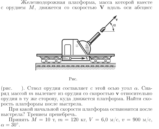 Железнодорожная платформа, масса которой вместе с орудием М, движется со скоростью V вдоль оси абсцисс (рис. 7.2). Ствол орудия составляет с этой осью угол а. Снаряд массой m вылетает из орудия со скоростью v относительно орудия в ту же сторону, куда движется платформа. Найти скорость платформы после выстрела. При какой начальной скорости платформа остановится после выстрела? Трением пренебречь. Принять М=10 т, m=120 кг, V=6,0 м/с, v=900 м/с, а=30°.