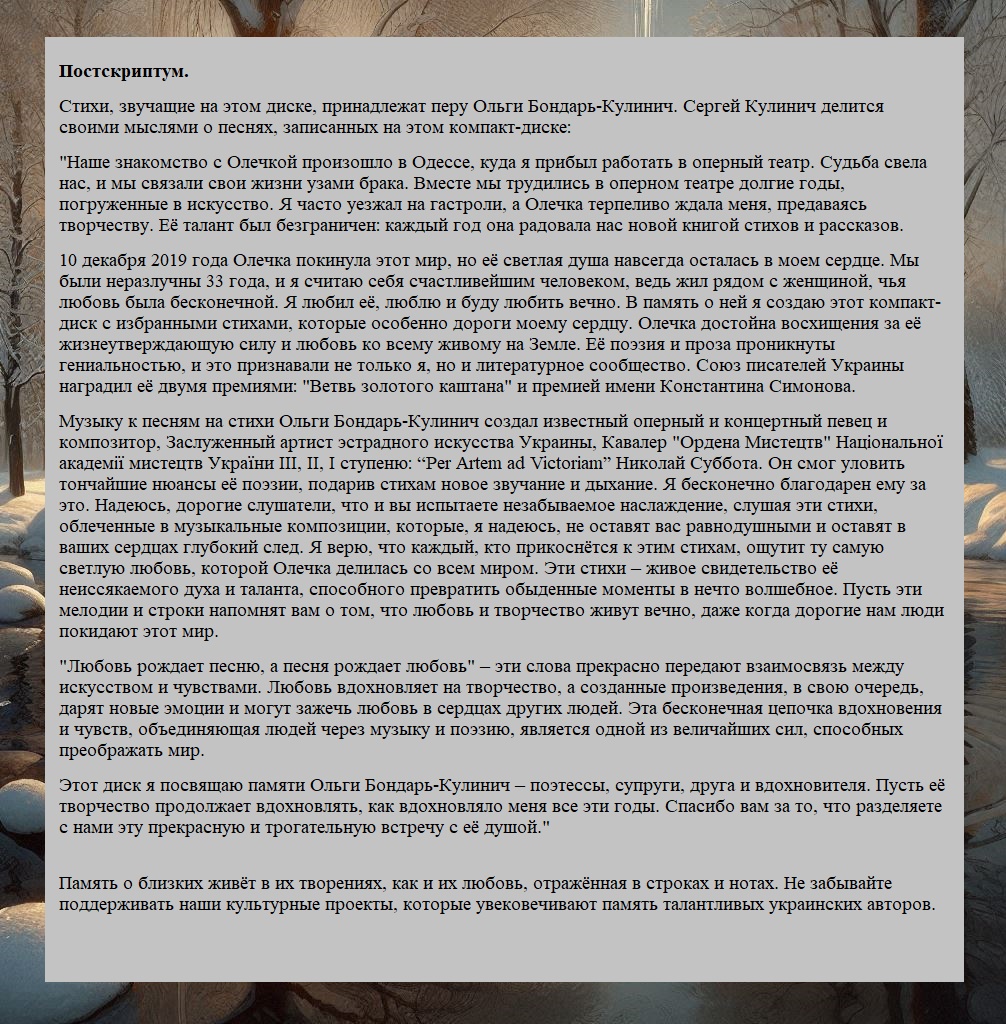Этот диск я посвящаю памяти Ольги Бондарь-Кулинич – поэтессы, супруги, друга и вдохновителя. Пусть её творчество продолжает вдохновлять, как вдохновляло меня все эти годы. Спасибо вам за то, что разделяете с нами эту прекрасную и трогательную встречу с её душой."