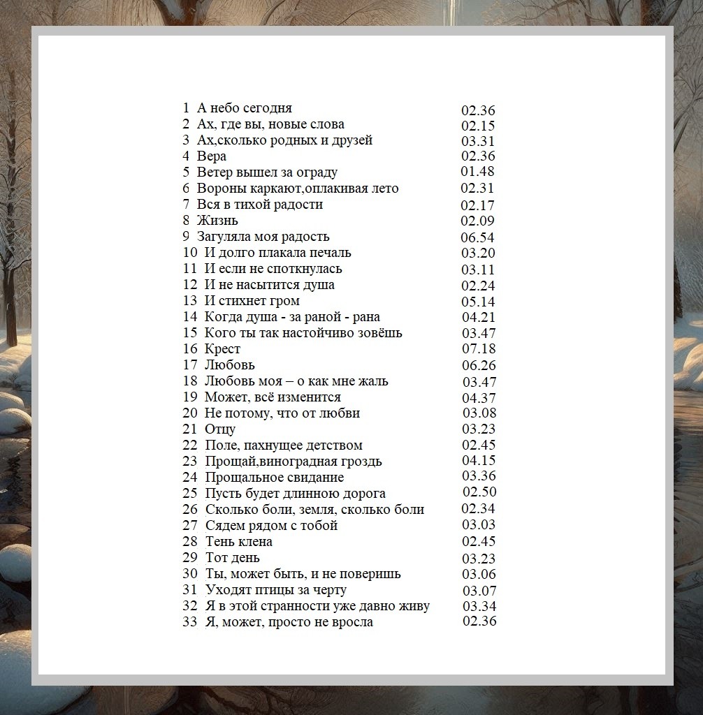 Стихи, звучащие на этом диске, принадлежат перу Ольги Бондарь-Кулинич. Сергей Кулинич делится своими мыслями о песнях, записанных на этом компакт-диске: