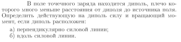 В поле точечного заряда находится диполь, плечо которого много меныне расстояния от диполя до источника поля. Определить действующую на диполь силу и вращающий момент, если диполь расположен: а) перпендикулярно силовой линии; б) вдоль силовой линии.