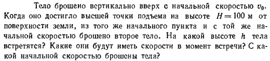 Тело брошено вертикально вверх с начальной скоростью v0. Когда оно достигло высшей точки подъема на высоте Н = 100 м от поверхности земли, из того же начального пункта и с той же начальной скоростью брошено второе тело. На какой высоте h тела встретятся? Какие они будут иметь скорости в момент встречи? С какой начальной скоростью брошены тела?