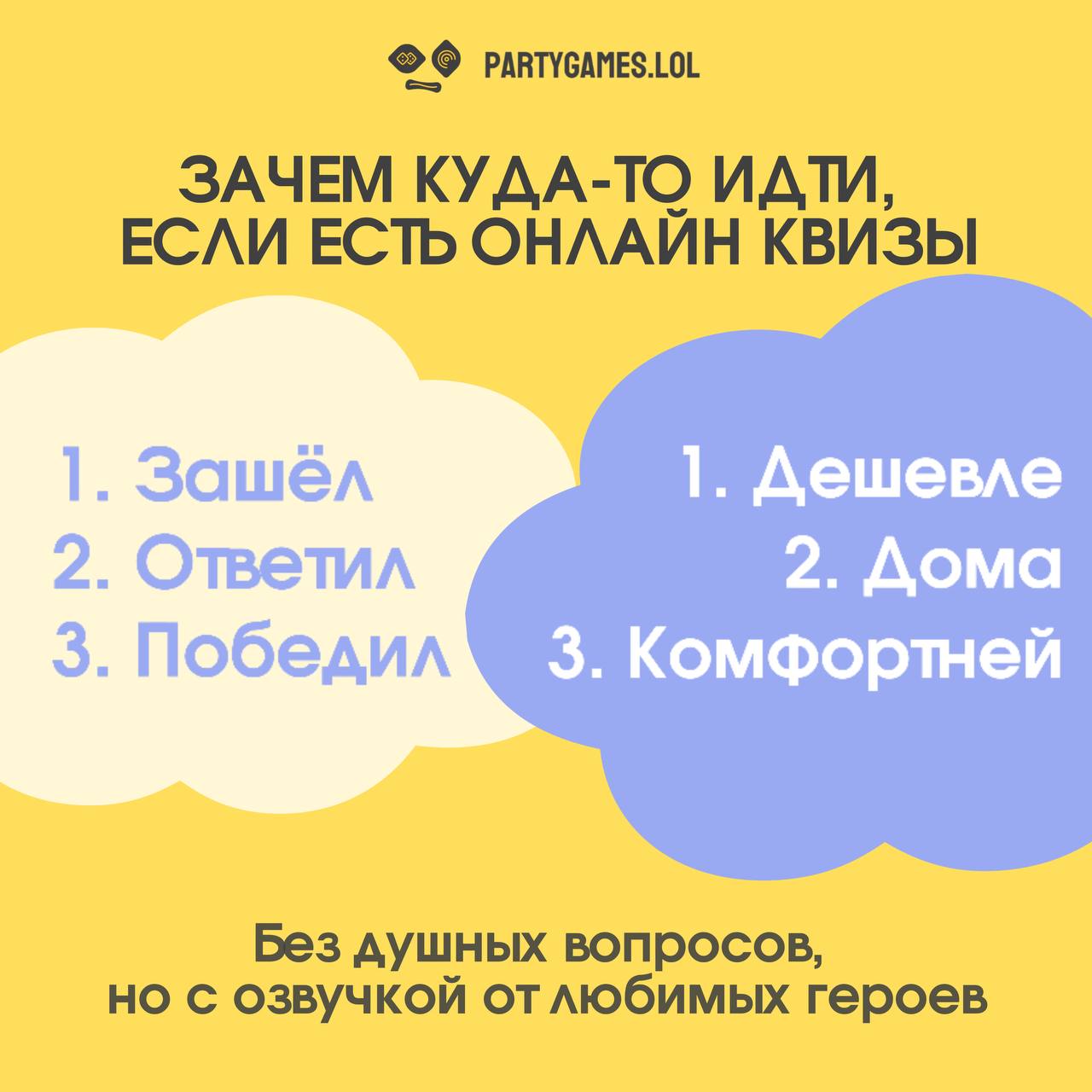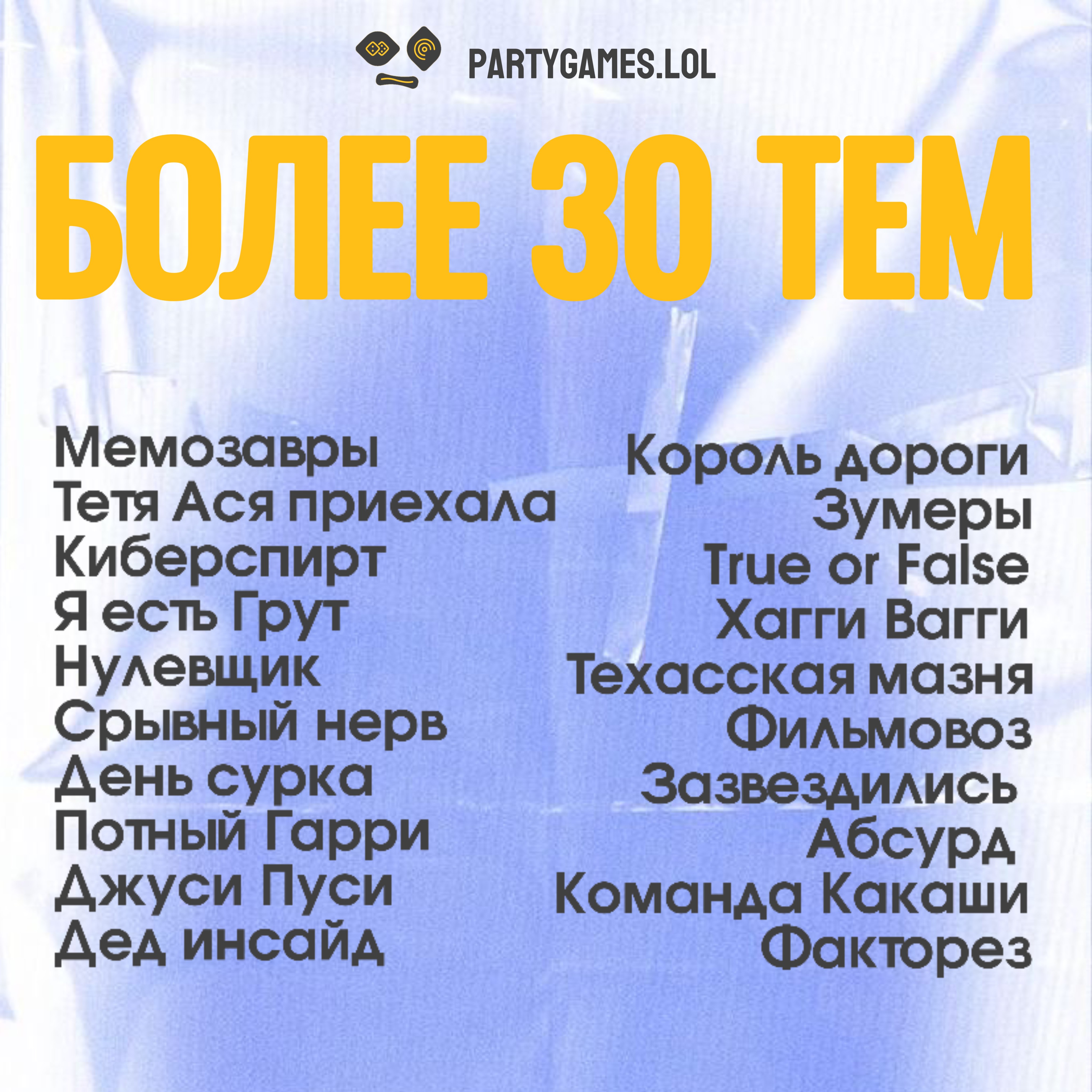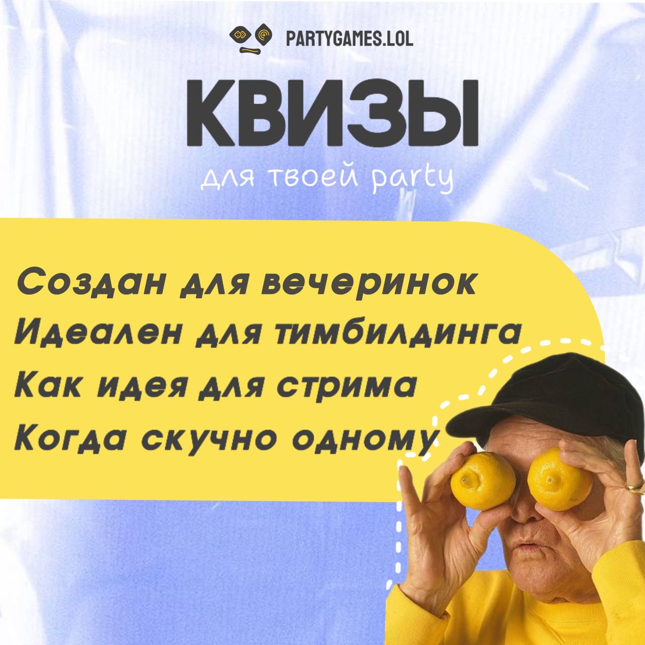 Создайте незабываемую атмосферу веселья и азарта. Partygames.lol — это ваш ключ к лучшим квиз-вечеринкам!