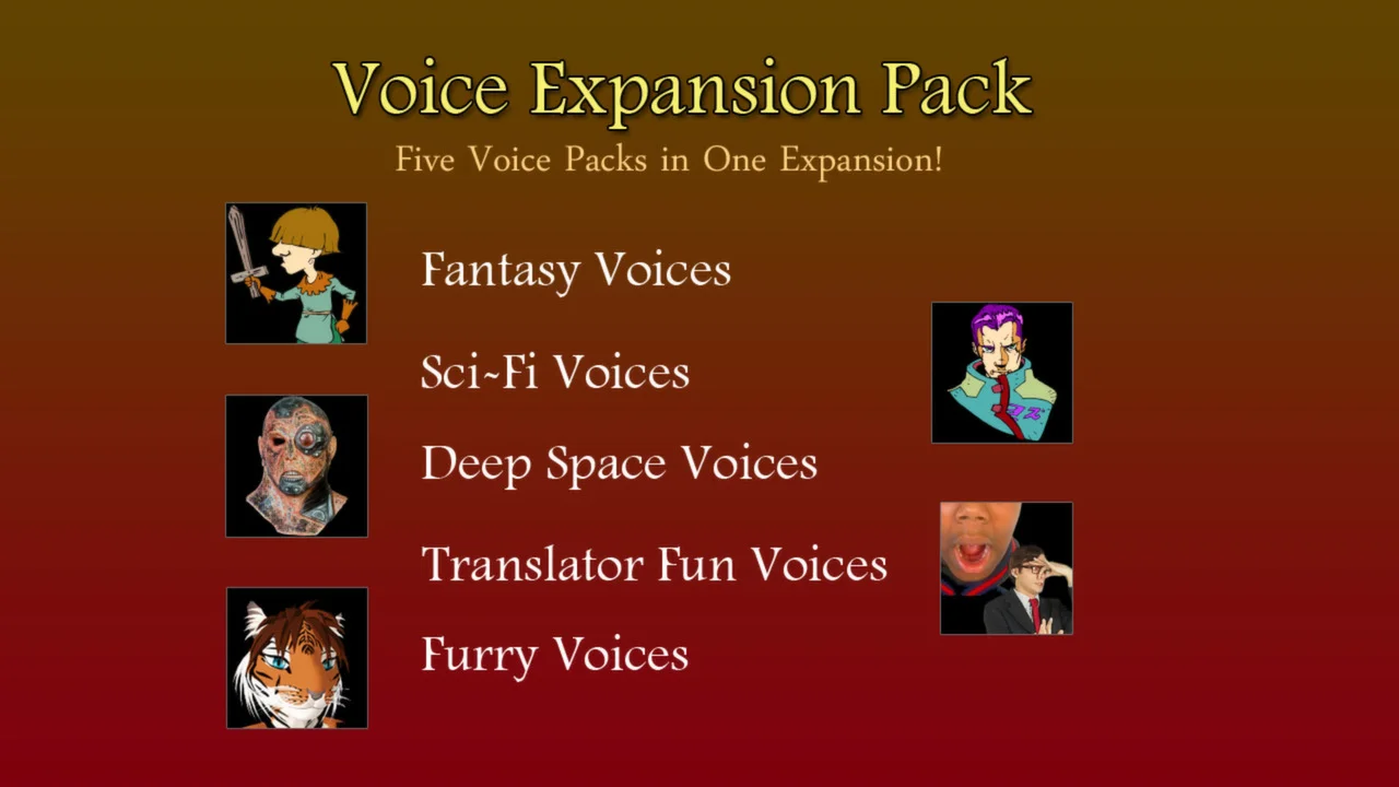 The Voice Expansion Pack for MorphVOX ProWe have added 5 of our popular voice packs to give you 36 more voices in one convenient DLC!Deep Space Voices: 6 voices that will compliment any chatting in your favorite space game.