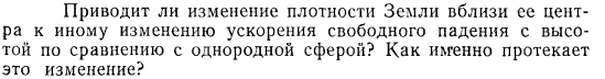 Приводит ли изменение плотности Земли вблизи ее центра к иному изменению ускорения свободного падения с высотой по сравнению с однородной сферой? Как именно протекает это изменение?