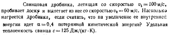 Свинцовая дробинка, летящая со скоростью v1 = 100 м/с, пробивает доску и вылетает из нее со скоростью v2 = 60 м/с Насколько нагреется дробинка, если считать, что на увеличение ее внутренней энергии идет а = 0,4 потерянной кинетической энергии? Удельная теплоемкость свинца с = 125 Дж/(кг·К).