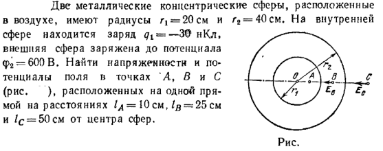Две металлические концентрические сферы, расположенные в воздухе, имеют радиусы r1 = 20 см и r2 = 40 см. На внутренней сфере находится заряд q1 = -30 нКл, внешняя сфера заряжена до потенциала ф2 = 600 В. Найти напряженности и потенциалы поля в точках А, В и С (рис. ), расположенных на одной прямой на расстояниях lА = 10 см, lВ = 25 см и lС = 50 см от центра сфер.