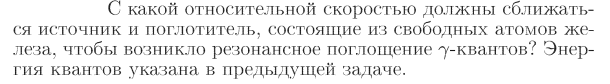 С какой относительной скоростью должны сближаться источник и поглотитель, состоящие из свободных атомов железа, чтобы возникло резонансное поглощение y-квантов? Энергия квантов 14,4 кэВ.