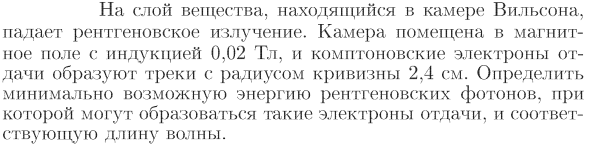 На слой вещества, находящийся в камере Вильсона, падает рентгеновское излучение. Камера помещена в магнитное поле с индукцией 0,02 Тл, и комптоновские электроны отдачи образуют треки с радиусом кривизны 2,4 см. Определить минимально возможную энергию рентгеновских фотонов, при которой могут образоваться такие электроны отдачи, и соответствующую длину волны.