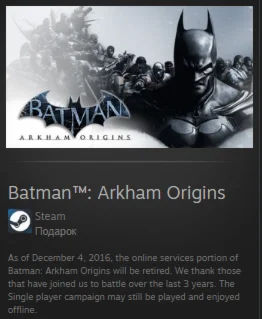 С 4 декабря 2016 г. часть онлайн-сервисов Batman: Arkham Origins будет прекращена. Мы благодарим тех, кто присоединился к нам в борьбе за последние 3 года. В одиночную кампанию по-прежнему можно играть и наслаждаться оффлайн.