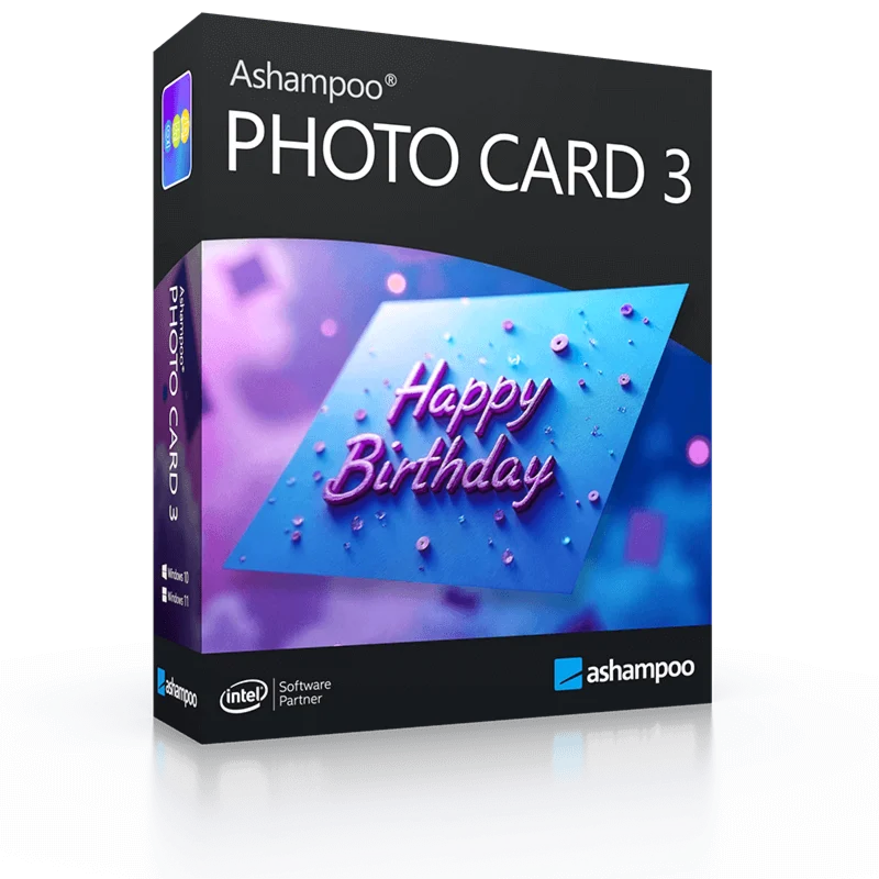 Ashampoo® Photo Card 3 - программное обеспечение для фотокарт, создавайте поздравительные открытки, Фотооткрытка Ashampoo 3, программное обеспечение для дизайна карт, инструменты для редактирования фотографий, шаблоны поздравительных открыток, интеграция фотографий с веб-камеры, праздничные открытки, открытки на день рождения, свадебные открытки, библиотека клипартов, оптимизация изображений, простое создание карт, обмен фотографиями, фотокарточки по электронной почте, интеграция с социальными сетями.