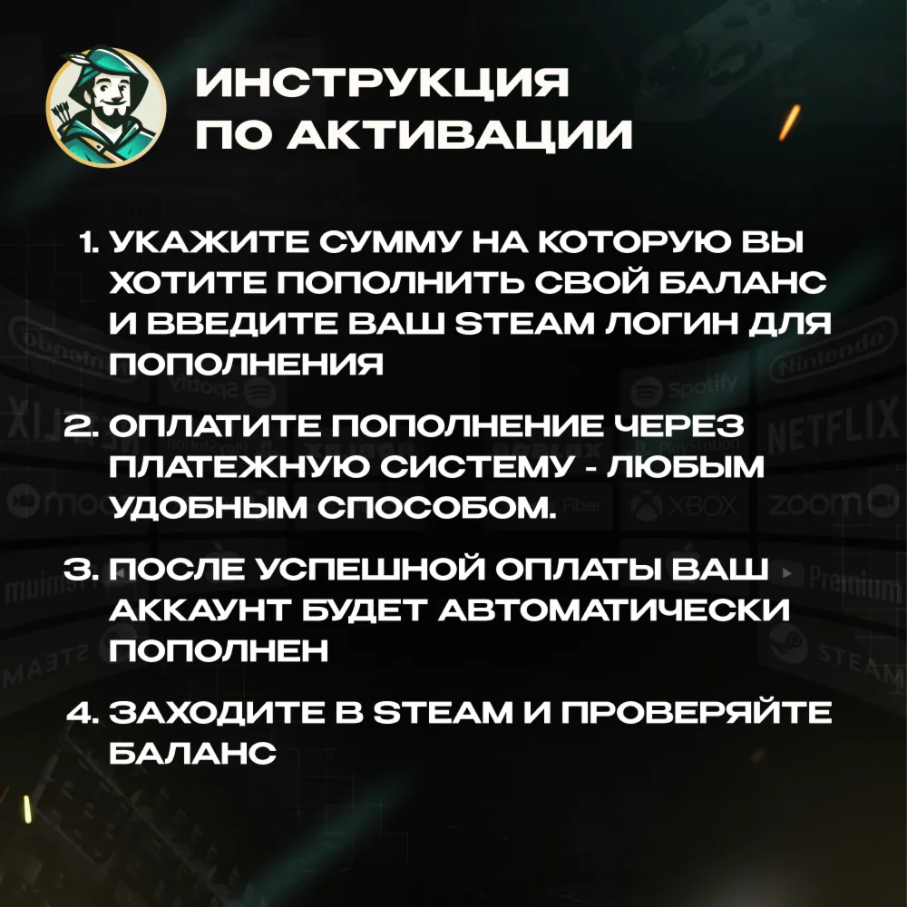 ???? Мы гарантируем полную безопасность предоставляемых данных. Логин вашего аккаунта Steam используется исключительно для корректного начисления средств на ваш профиль. Мы не собираем, не храним и не используем вашу информацию в корыстных или иных целях.