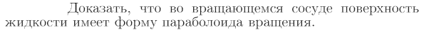 Доказать, что во вращающемся сосуде поверхность жидкости имеет форму параболоида вращения.