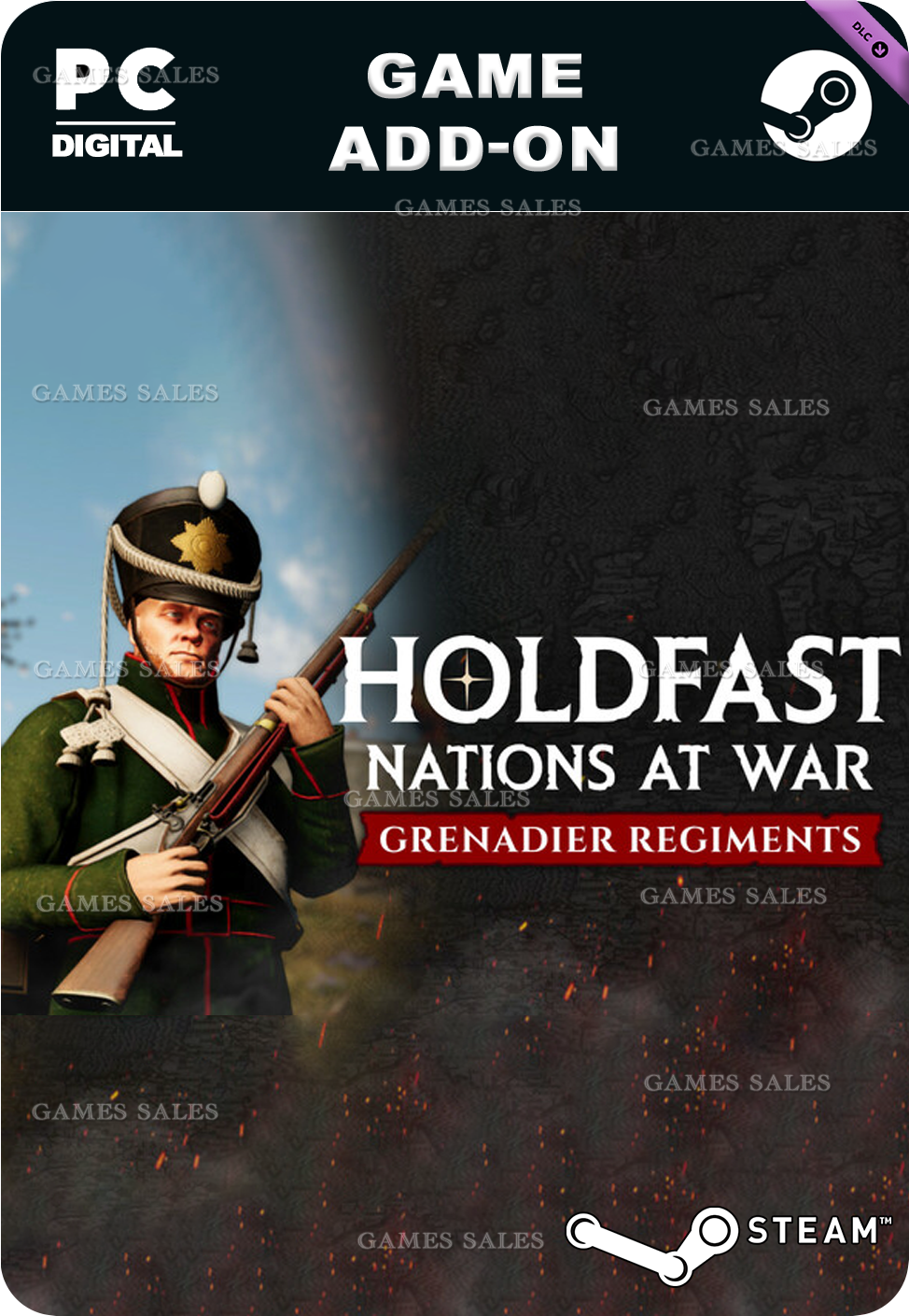 ==================================But all the world’s brave heroes, there’s none that can compare! Soldier with these dashing fellows from the Grenadier Regiment DLC and march onwards valiantly into the fray.Content present in Holdfast DLCs is purely cosmetic. It doesn’t and never will impact gameplay. Your kind generosity will be put to good use and bring this genre of roleplay warfare games that all of us are fond of into the limelight. The Grenadier Regiments DLC unlocks 6 unique uniforms for the Grenadier class ● Unlock the British Empire's Belgian 7th Line Battalion uniform. ● Unlock the French Empire’s Polish 4th Infantry Regiment uniform. ● Unlock the Kingdom of Prussia’s 1st Silesian Infantry Regiment uniform. ● Unlock the Russian Empire’s Nizhnii-Novgorod Opolcheniye uniform. ● Unlock the Kingdom of Italy's Battaglione Guardia Alla Città di Milano uniform. ● Unlock the Austrian Empire's Serbische Freikorps uniform. ● Unlock the Grenadier Of The Line portrait for your playercard. ● Unlock the The Veteran title for your playercard.