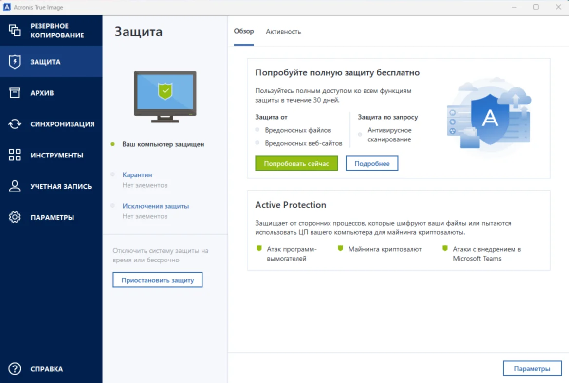 Одной из важных функций Acronis True Image является полноценная антивирусная защита ваших данных в режиме реального времени. Модуль Acronis Active Protection обеспечивает защиту от вирусов, вредоносных программ и шифраторов, которые могут повредить вашу систему и файлы. Антивирус в составе Acronis True Image включает опции сканирования, карантин, список исключений, веб-фильтрацию и другие функции и настройки защиты.