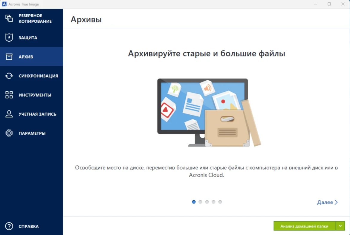 Acronis True Image - программа для комплексной защиты файлов и папок от повреждения, удаления или повреждения вирусами. Программа позволяет настроить и автоматически выполнять резервное копирование файлов, а также обеспечивает защиту файлов от вирусов, шифраторов и вредоносных программ.