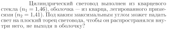 Цилиндрический световод выполнен из кварцевого стекла (n1=1,46), оболочка — из кварца, легированного примесями (n2=1,41). Под каким максимальным углом может падать свет на плоский торец световода, чтобы он распространялся внутри него, не выходя в оболочку?