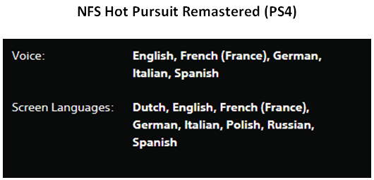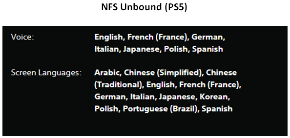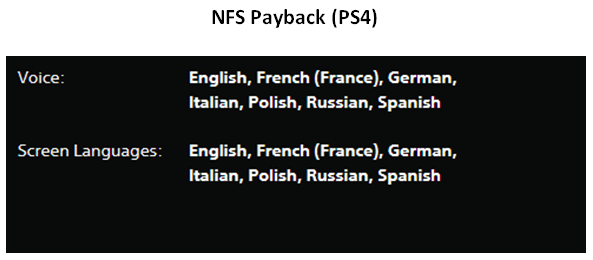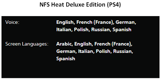 Наличие русского языка: Есть русские субтитры, русская озвучка только в NFS Heat,NFS Payback. NFS Unbound русский язык отсутствует.