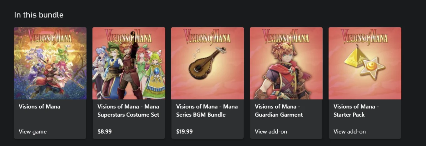 Этот продукт является комплектом, содержащим полную игру Visions of Mana, Mana Superstars Costume Set и Mana Series BGM Bundle.