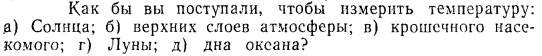 Как бы вы поступали, чтобы измерить температуру; а) Солнца; б) верхних слоев атмосферы; в) крошечного насекомого; г) Луны; д) дна океана?