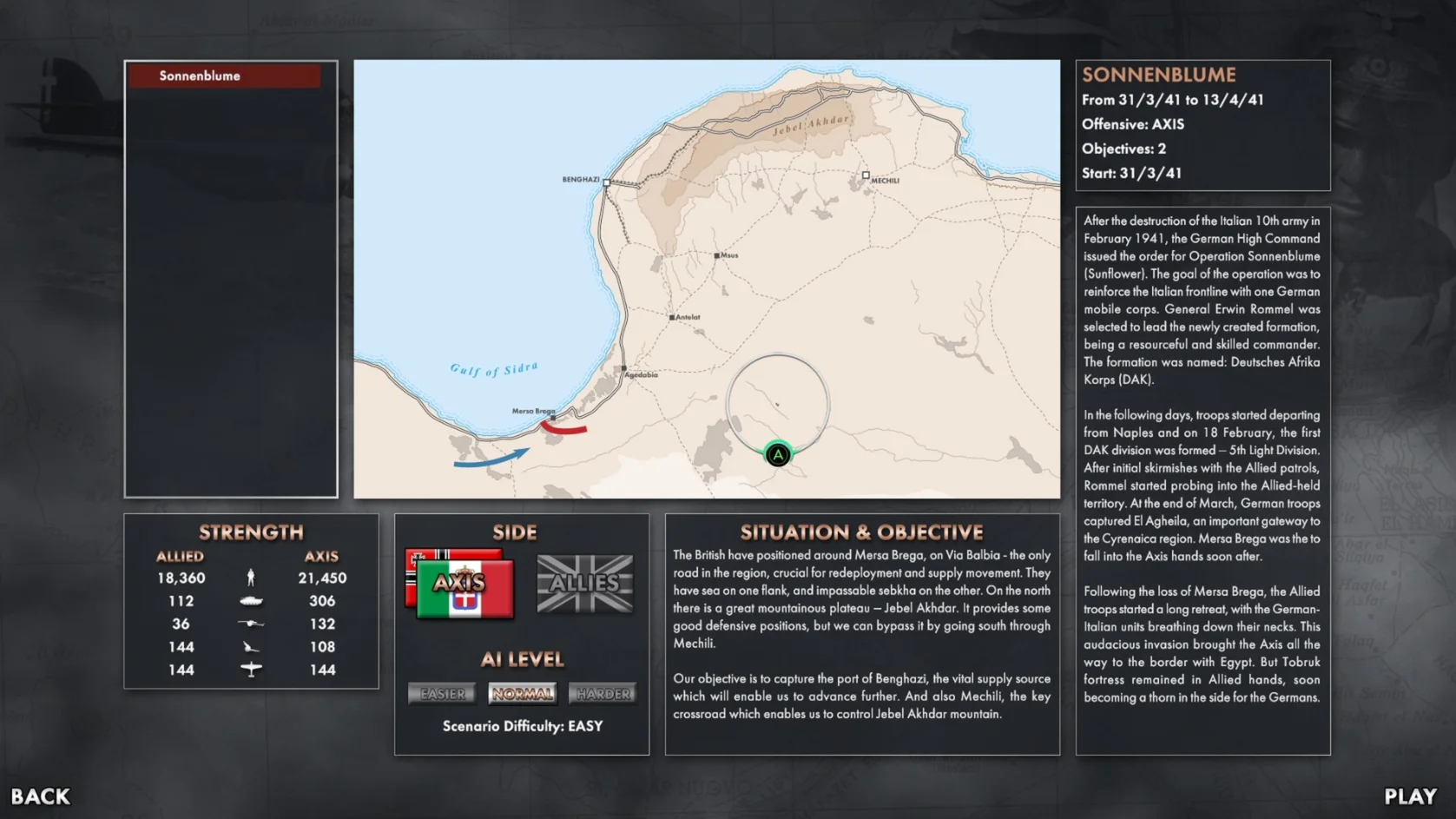 Немецкие войска начинают разведку в ливийском регионе Киренаика, а игра завершается либо полным разгромом немецко-итальянской танковой армии, либо потерей британцами Египта и отступлением через Суэцкий канал.
