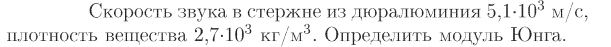 Скорость звука в стержне из дюралюминия 5,1·103 м/с, плотность вещества 2,7·103 кг/м3. Определить модуль Юнга.