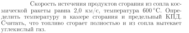 Скорость истечения продуктов сгорания из сопла космической ракеты равна 2,0 км/с, температура 600 °С. Определить температуру в камере сгорания и предельный КПД. Считать, что тоёпливо сгорает полностью и из сопла вытекает углекислый газ.