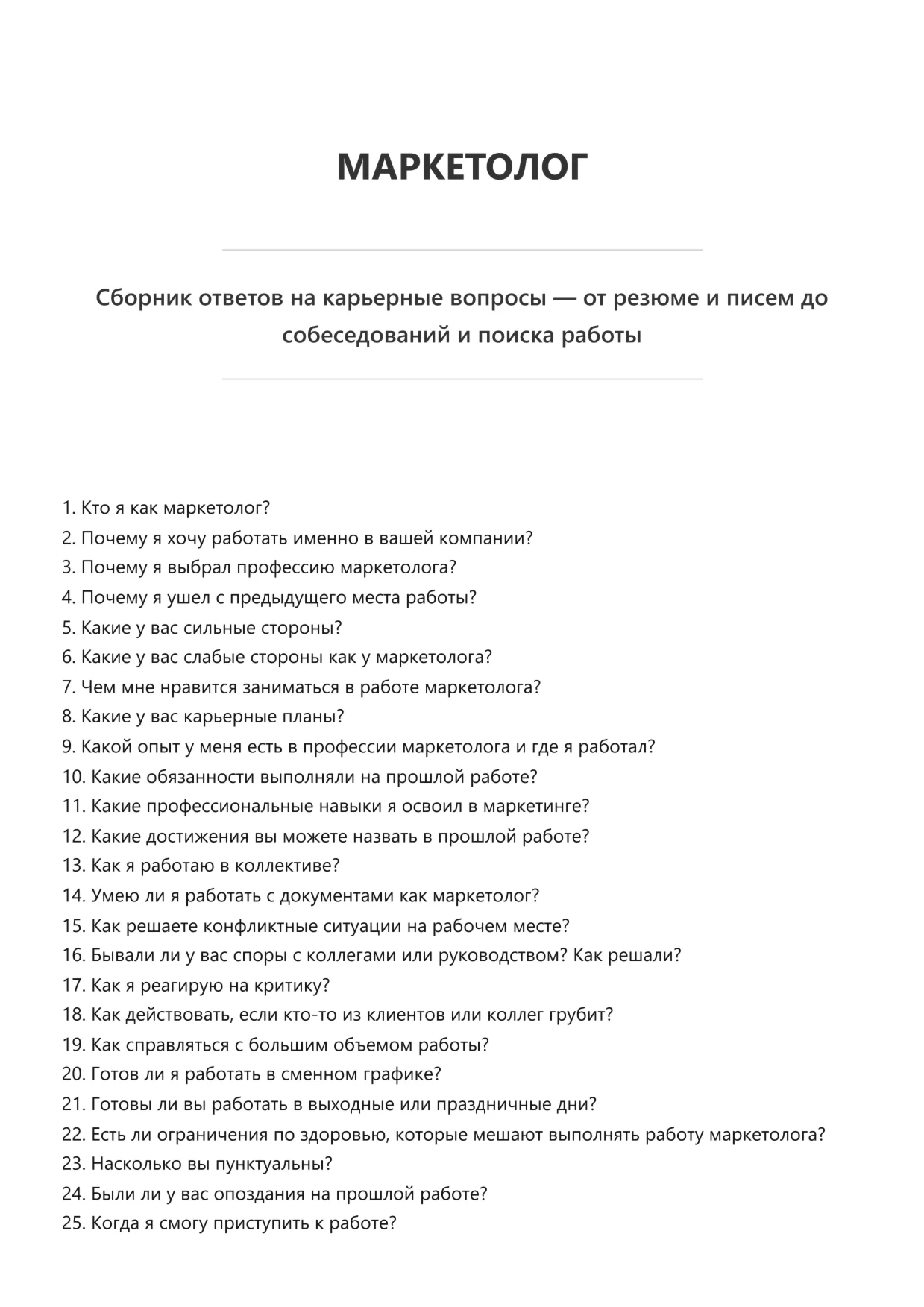 Эта электронная книга представляет собой сборник вопросов и ответов, которые часто возникают у соискателей на разных этапах поиска работы. В ней собран практический опыт и советы, которые помогут быстрее разобраться в нюансах трудоустройства и уверенно действовать в любых ситуациях.