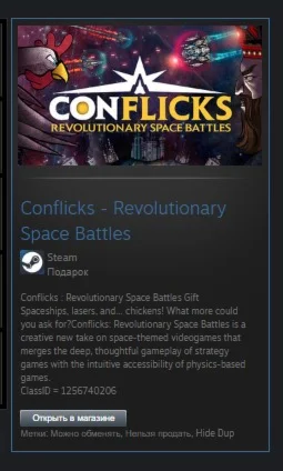 Космические корабли, лазеры и… куры! Чего ещё желать? Conflicks: Revolutionary Space Battles — это новый творческий взгляд на космическую тематику, сочетающий глубокий и продуманный игровой процесс стратегических игр с интуитивной доступностью игр, основанных на законах физики.