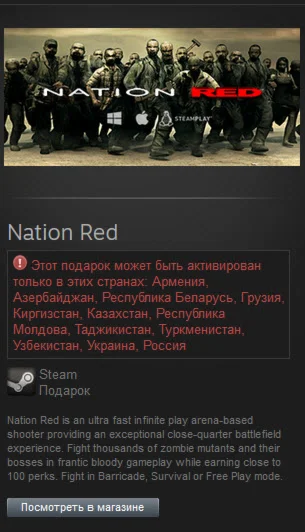После оплаты вы моментально получаете уникальную ссылку, при переходе по которой получаете steam gift "Nation Red", который можете добавить в свою библиотеку или положить в инвентарь.