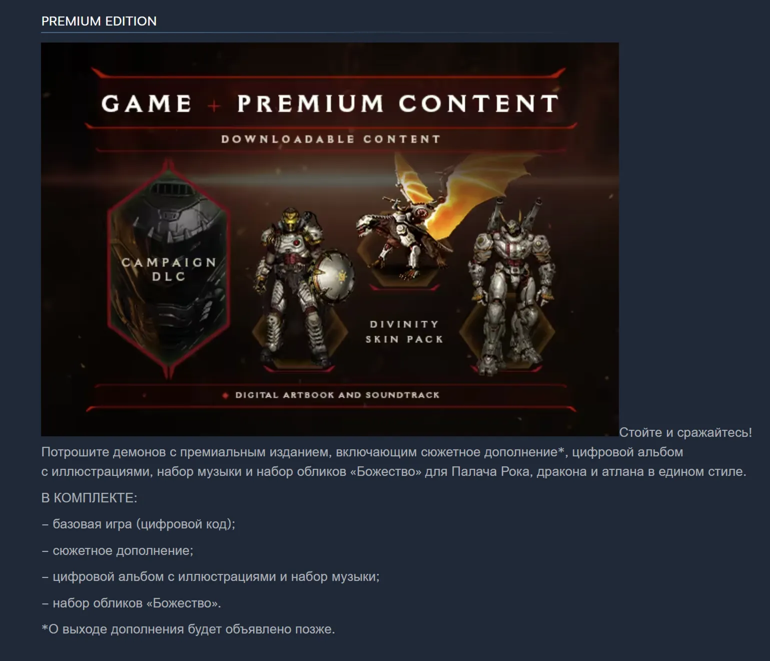 Стойте и сражайтесь! Потрошите демонов с премиальным изданием, включающим сюжетное дополнение**, цифровой альбом с иллюстрациями, набор музыки и набор обликов «Божество» для Палача Рока, дракона и атлана в едином стиле.