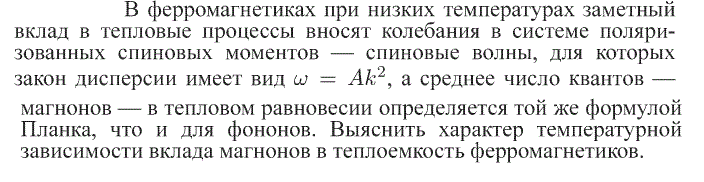 В ферромагнетиках при низких температурах заметный вклад в тепловые процессы вносят колебания в системе поляризованных спиновых моментов — спиновые волны, для которых закон дисперсии имеет вид w = Аk2 , а среднее число квантов — магнонов — в тепловом равновесии определяется той же формулой Планка, что и для фононов. Выяснить характер температурной зависимости вклада магнонов в теплоемкость ферромагнетиков.