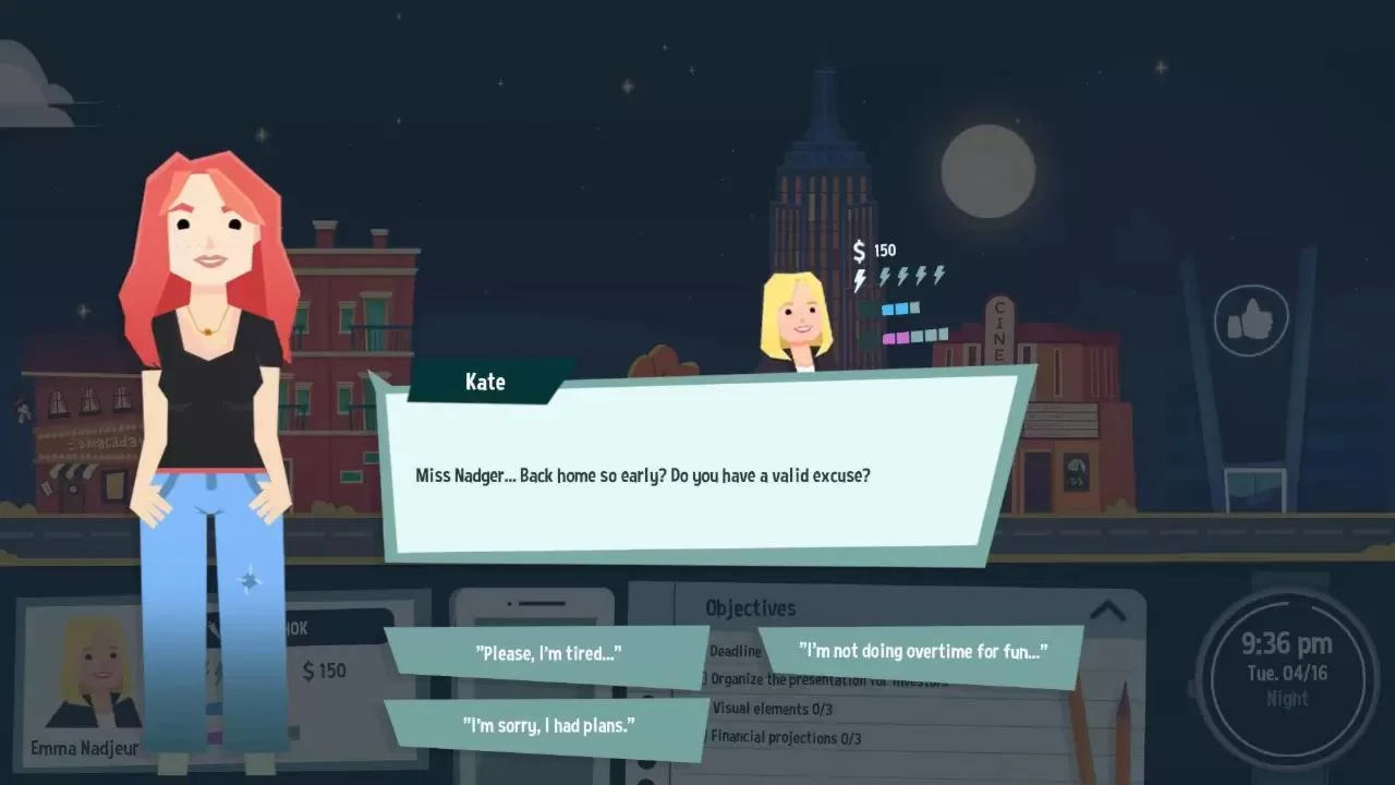 Best Day Ever is a narrative game in which you will play 4 characters. Your goal? Manage their daily life and help them overcome their difficulties to create their best day ever. EXPERIENCE 4 RICH STORIES In Waters City, the picture is not all bright. Emma, Jordan, Paul and Jenny won't say otherwise: they face many injustices on a daily basis and need your help to face these trials. Get to know them and achieve their goals by making good decisions with them. YOUR CHOICES HAVE A REAL IMPACT Each story has multiple endings. It is YOUR decisions that will change the events experienced by the characters and trace their path to their best day ever. And what if these seemingly independent stories were finally linked together? ENDEARING CHARACTERS Emma Nadger: Manager in the food company KraKer, Emma provides quality work and doesn't count her hours. However, she regularly receives sexist remarks from some of her peers and can no longer stand it. Jordan Neal: Jordan is a key player in the Waters University basketball team. The team has qualified for the big university tournament, a once-in-a-lifetime opportunity for the team members. His partner feels this is the perfect opportunity for Jordan to finally introduce him to his teammates. Jenny: As a student at the prestigious Waters University, Jenny has always had good grades. However, a few weeks before her midterms, she can no longer focus on her studies and is anxious about getting to class. Paul Hitik: Paul is one of the 5 candidates in the Waters mayoral election. He is aware that his city is the place of many injustices and intends to defend his candidacy to change things on a large scale. KEEP IN TOUCH WITH THEIR RELATIVES With dozens of side characters, Best Day Ever deepens many relationships of friendship, love and rivalry. To stay in touch with Emma, Jordan, Jenny and Paul's friends, the phone is your best ally. You can send and receive calls, messages or keep an eye on important appointments.