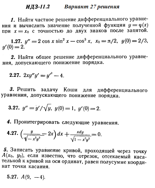 Решения 5-и заданий на дифференциальные уравнения из Рябушко части 2 ИДЗ 11.2 вариант 27