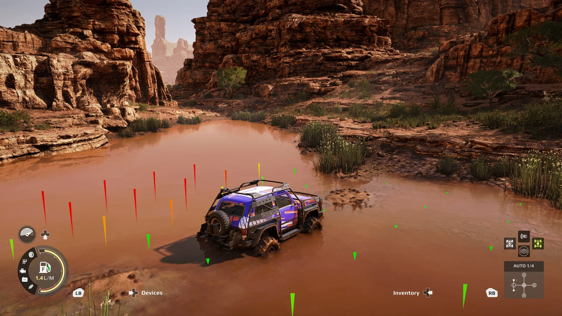 ● Проезжайте по пересеченной местности при помощи арсенала самых современных устройств, вроде якорей, для преодоления крутых подъемов и спусков, или эхолокаторов для проверки глубины водоема.