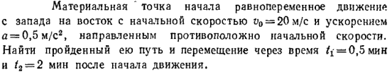 Материальная точка начала равнопеременное движение с запада на восток с начальной скоростью v0 = 20 м/с и ускорением а = 0,5 м/с2, направленным противоположно начальной скорости. Найти пройденный ею путь и перемещение через время t1 = 0,5 мин и t2 = 2 мин после начала движения.
