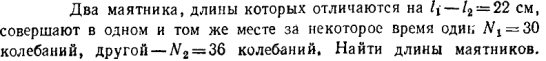 Два маятника, длины которых отличаются на l1 - l2 = 22 см, совершают в одном и том же месте за некоторое время один N1 = 30 колебаний, другой — N2 = 36 колебаний. Найти длины маятников.