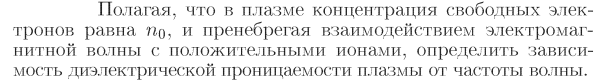 Полагая, что в плазме концентрация свободных электронов равна n0, и пренебрегая взаимодействием электромагнитной волны с положительными ионами, определить зависимость диэлектрической проницаемости плазмы от частоты волны.