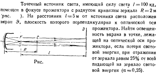 Точечный источник света, имеющий силу света I = 100 кд, помещен в фокусе прожектора с радиусом кривизны зеркала R = 2 м (рис. ). На расстоянии l = 5 м от источника света расположен экран Э, плоскость которого перпендикулярна к оптической оси прожектора. Найти освещенность экрана в точке, лежащей на оптической оси прожектора, если потери световой энергии при отражении от зеркала равны 25% от всей падающей на зеркало световой энергии (а = 0,25).