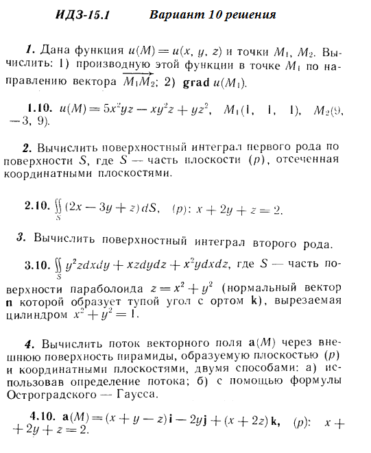 Решения 4-х заданий на поверхностные интегралы из Рябушко части 3 ИДЗ 15.1 вариант 10