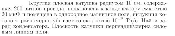 Круглая плоская катушка радиусом 10 см, содержащая 200 витков провода, подключена к конденсатору емкостью 20 мкФ и помещена в однородное магнитное поле, индукция которого равномерно убывает со скоростью 10-2 Тл/с. Найти заряд конденсатора. Плоскость катушки перпендикулярна силовым линиям поля.
