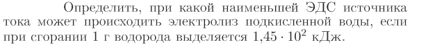 Определить, при какой наименьшей ЭДС источника тока может происходить электролиз подкисленной воды, если при сгорании 1 г водорода выделяется 1,45·102 кДж.