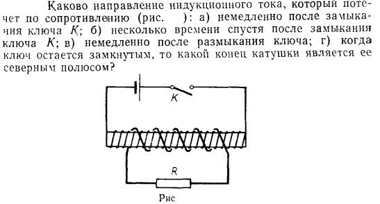 Каково направление индукционного тока, который потечет по сопротивлению (рис. ): а) немедленно после замыкания ключа К; б) несколько времени спустя после замыкания ключа К; в) немедленно после размыкания ключа; г) когда ключ остается замкнутым, то какой конец катушки является ее северным полюсом?