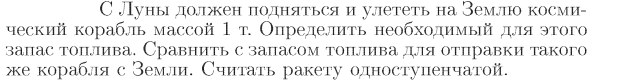 С Луны должен подняться и улететь на Землю космический корабль массой 1 т. Определить необходимый для этого запас топлива. Сравнить с запасом топлива для отправки такого же корабля с Земли. Считать ракету одноступенчатой.