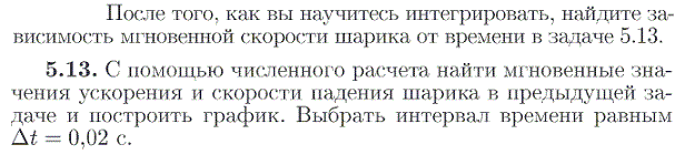 После того, как вы научитесь интегрировать, найдите зависимость мгаовенной скорости шарика от времени в задаче 5.13. 5.13. С помощью численного расчета найти мгновенные значения ускорения и скорости падения шарика в предыдущей задаче и построить график. Выбрать интервал времени равным dt=0,02 с.