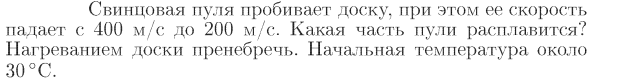 Свинцовая пуля пробивает доску, при этом ее скорость падает с 400 м/с до 200 м/с. Какая часть пули расплавится? Нагреванием доски пренебречь. Начальная температура около 30 °С.