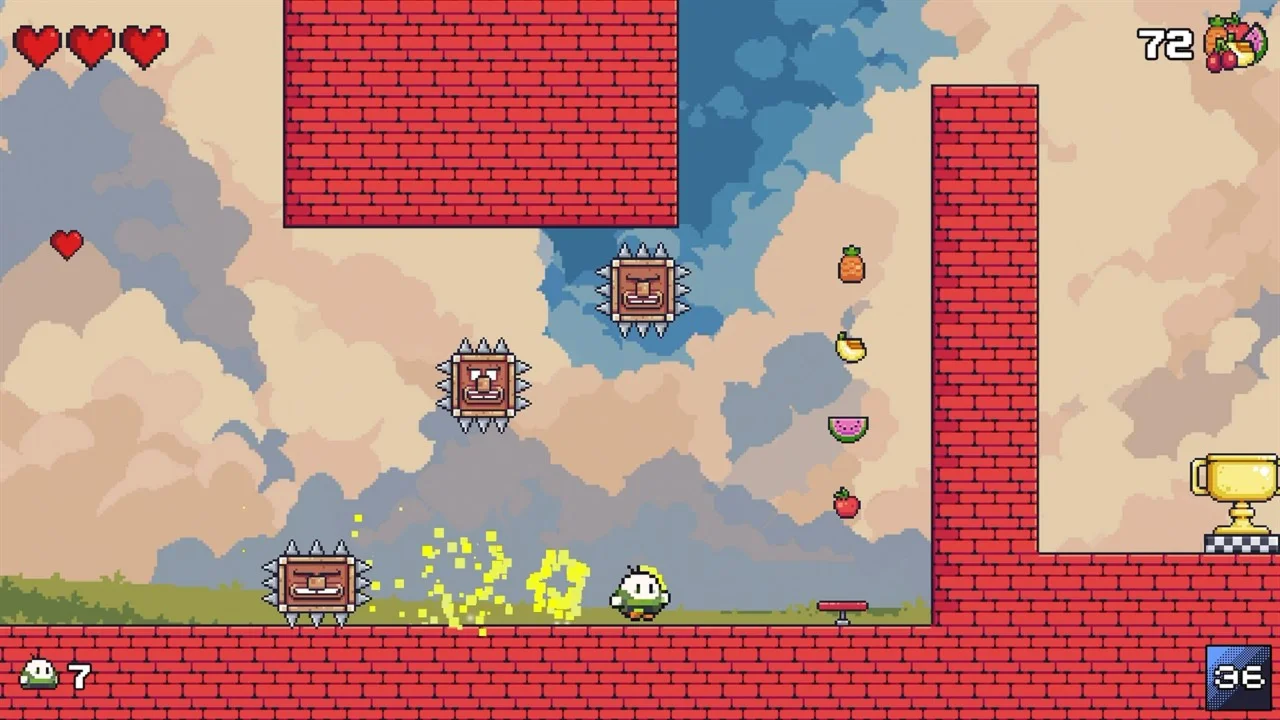 Используйте трамплины, чтобы взбираться на новые высоты, и касайтесь флагштоков, чтобы сохранять свой прогресс. Избегайте ловушек с шипами и прыгайте на головы врагов, чтобы защитить Попотиньо. Сможете ли вы вернуть его родителям и восстановить атмосферу счастливого праздника?